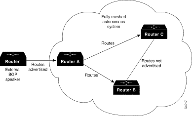 In the configuration shown in Figure 29, with synchronization on, Router B does not advertise network 198.92.68.0 to Router A until an IGRP route for network 198.92.68.0 exists. If you specify the no synchronization router configuration command, Router B advertises network 198.92.68.0 as soon as possible. However, because routing information still must be sent to interior peers, you must configure a full internal BGP mesh.